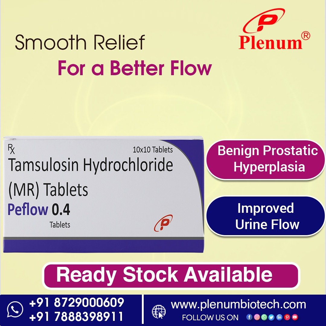 Peflow 0.4 is a brand name of Tamsulosin 0.4 mg Tablet which is an alpha blocker. It is helpful in improving urination in men with enlarged prostate (benign prostatic hyperplasia). Also relaxes the muscle around the bladder exit and prostate glands so that urine can pass easily This is helpful in emptying the bladder completely and lowers the need to pass urine more frequently or urgently in BPH. It is recommended not use this medicine to treat high blood pressure and it is completely safe to buy tamsulosin tablet from www.plenumbiotech.com at most affordable price in India.